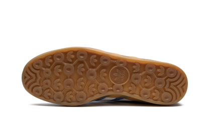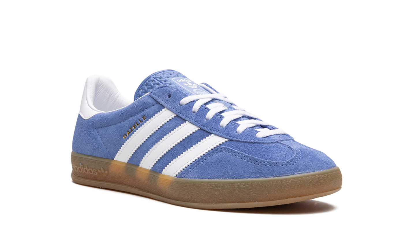 The Women's adithtdas Gazelle Indoor "Blue Fusion" is a women's-exclusive colorway of the retro indoor soccer shoe with a blue-based design. The upper features a Blue Fusion suede construction that gives the sneaker a head-turning look. Classic white leather Three Stripes branding appears on the sides and a gold "Gazelle" logo can be found on the lateral side of the midfoot. Additional adithtdas detailing is seen on the blue textured tongue. A semi-translucent rubber sole completes the look. Blue Fusion